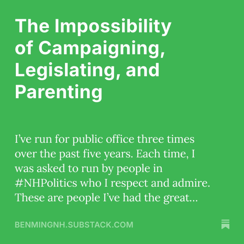 As for what's next...I'll spend more time with my family, who gave a lot of themselves to make my time at the State House and on the campaign trail possible. There's a lot to fix in politics right now, and it won't happen overnight. I'll continue to serve on the Hollis Planning Board, and you can see what I think of the upcoming legislation on my socials. Until next time.